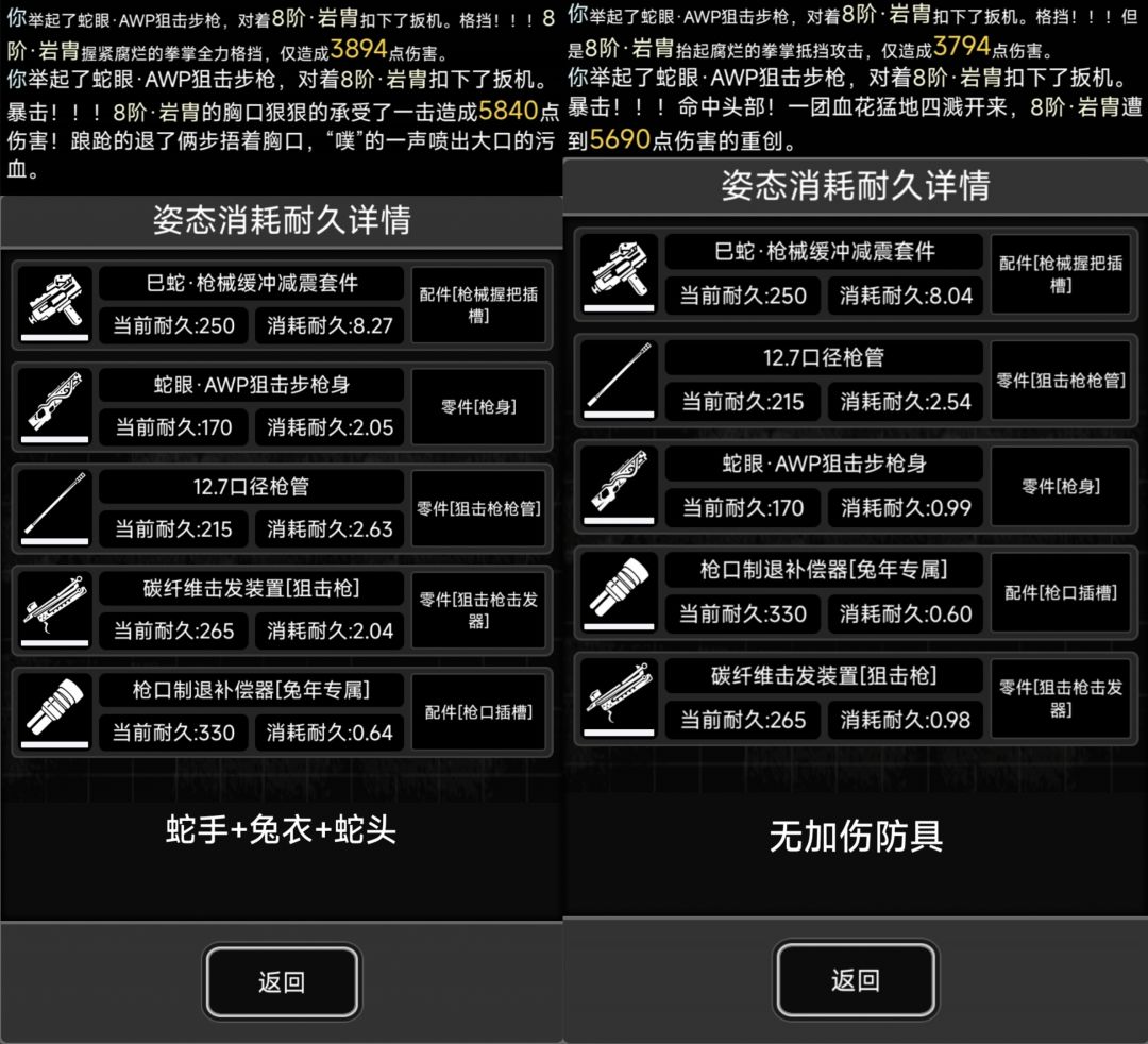 有无加伤防具的伤害与耐久消耗