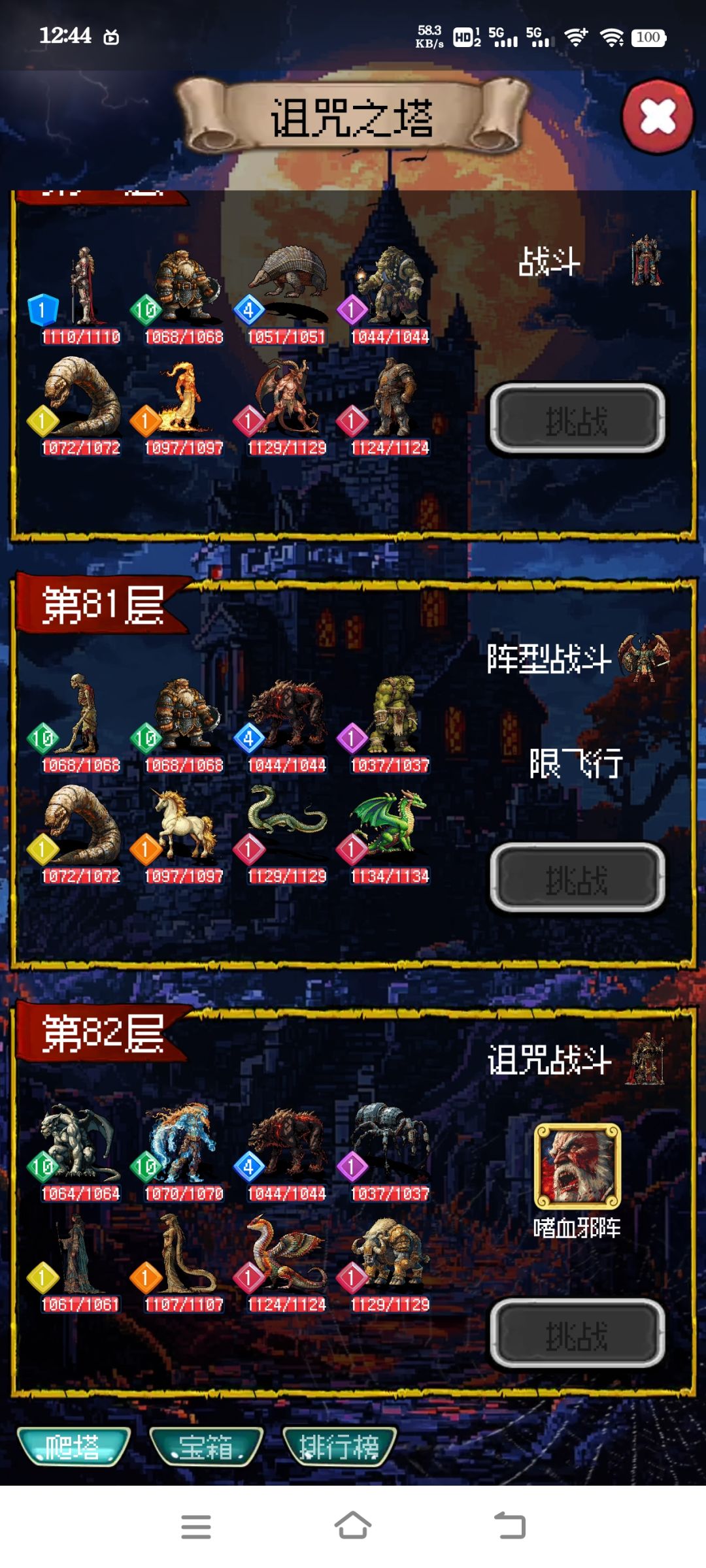 从35层到82层全是一千多血量,攻79防59。就这难度排行榜第一2000层,绝了