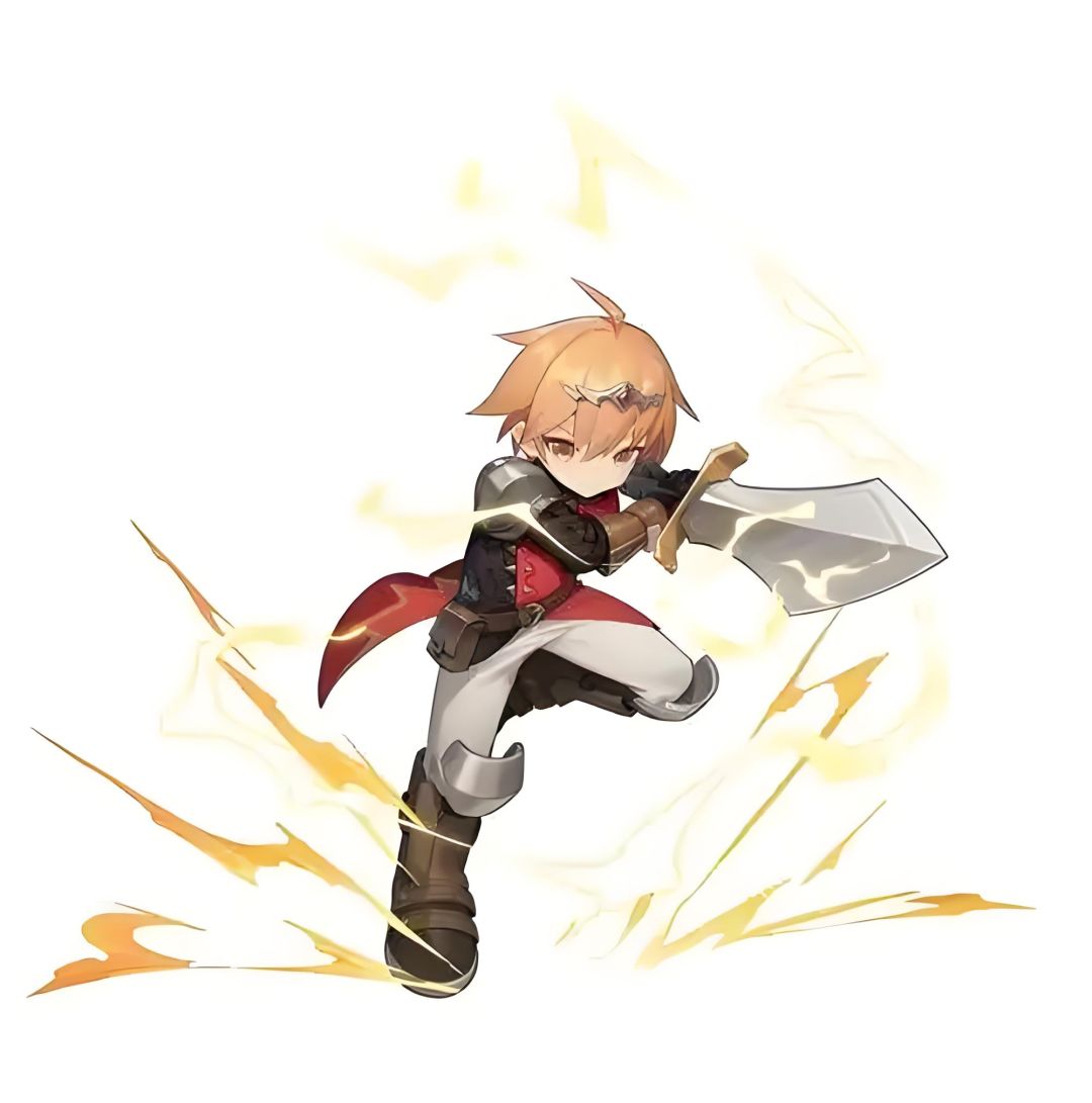 一个橙发少年双手持着剑,橙色闪电浑身萦绕,他起先蓄势,紧接着手臂持剑倚在一边顺势向巨大史莱姆劈砍而去。