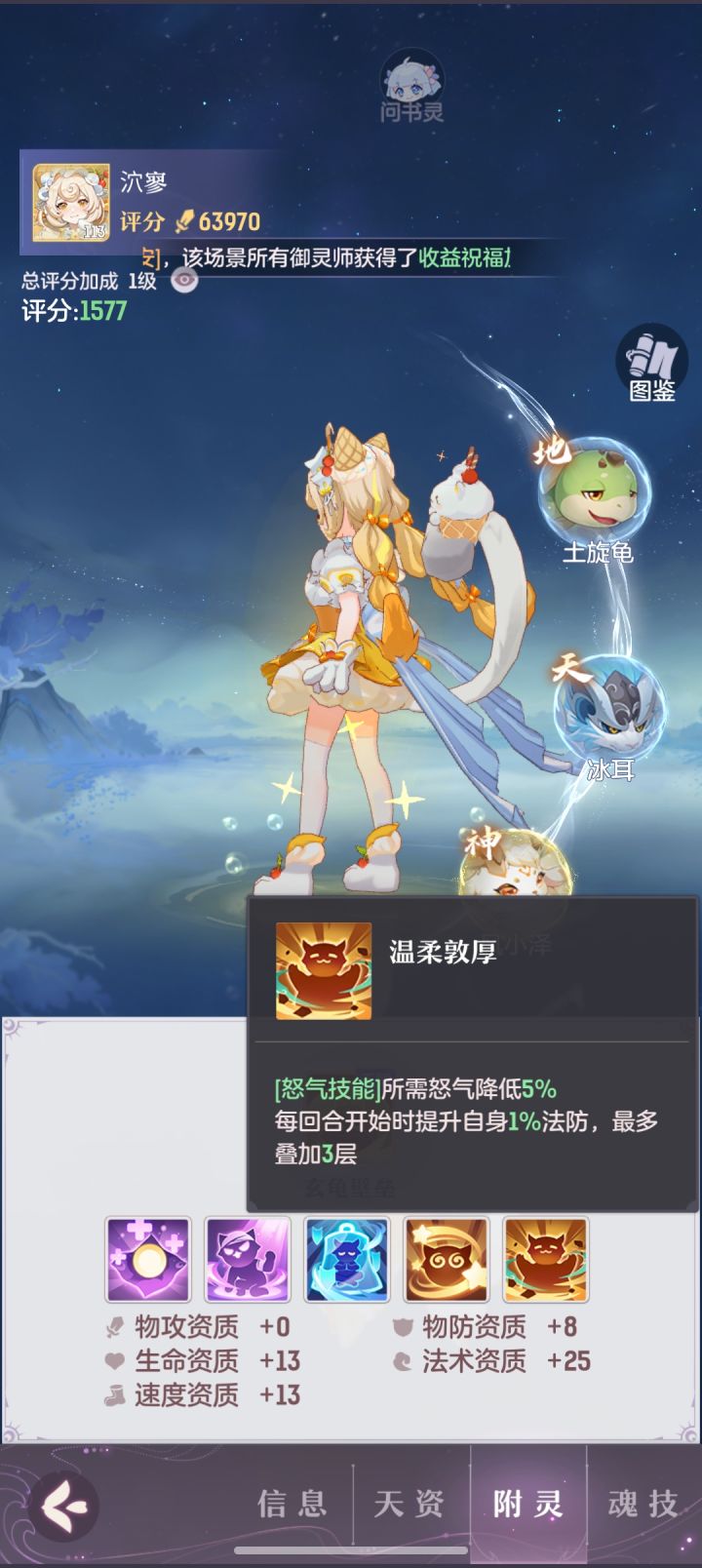 例二∶温柔敦厚这个特性,三回合3%的法防,对于叠加宝宝自身的生存能力是很好用的,并且注意看,所需怒气减少5%,我们再看下图3带了技突的鼎的技能介绍,每回合扣除5的怒气,第二篇攻略有说过,晨星附灵妖灵天赋建议选龟的墙,龟的墙怒气需要100,但是一般在55里面,一速晨星容易被对面鼎,限制你晨星的速度和怒气,让你晨星拉不了人和放不出龟的墙(你晨星满怒的情况下),才思敏捷和温柔敦厚两个特性就能很好的解决这个问题(特性加百分比速度、鼎扣的怒和特性减少的怒相抵,相当于95的怒就可以放墙)