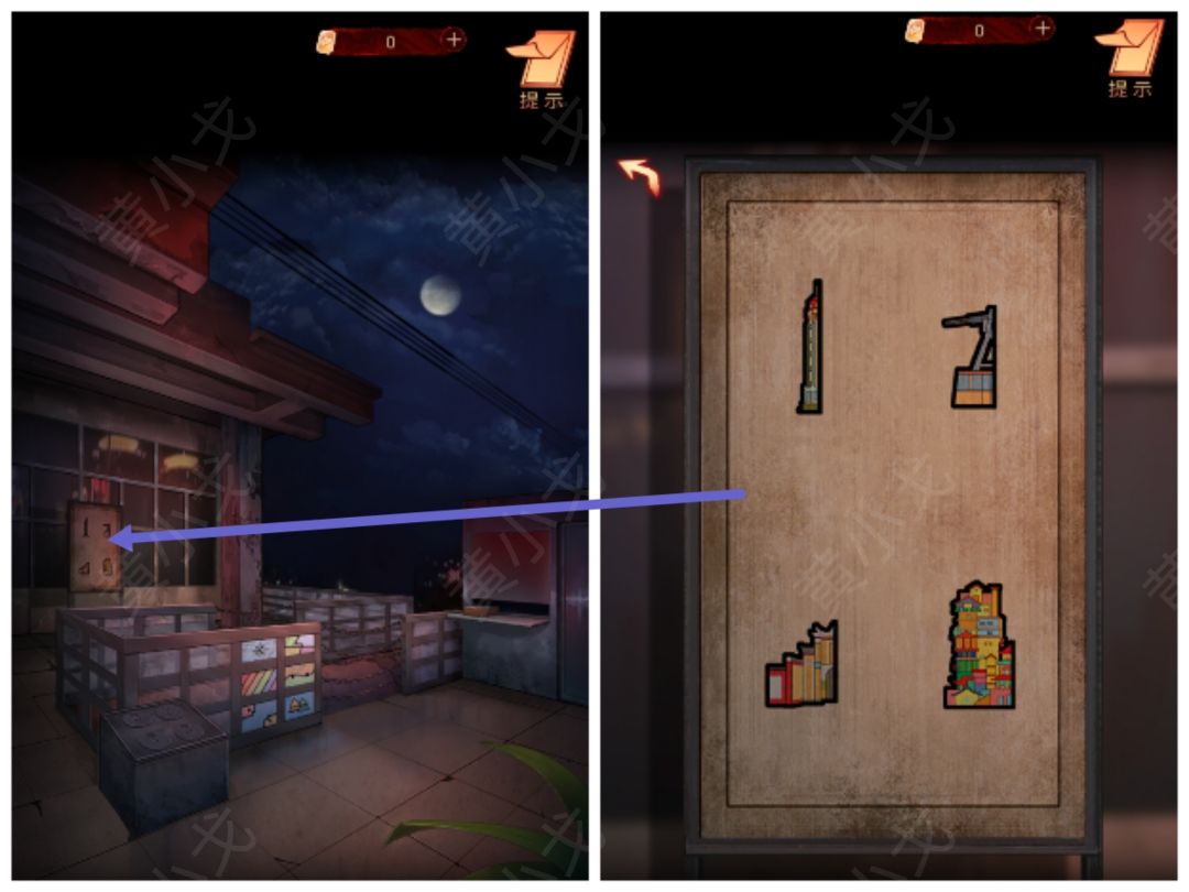 4.点击查看两边柜子上的物品为4个竹笼。点击门中间的灯,灯的投影为书本