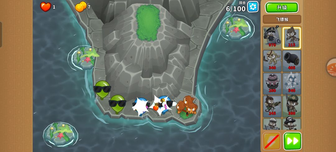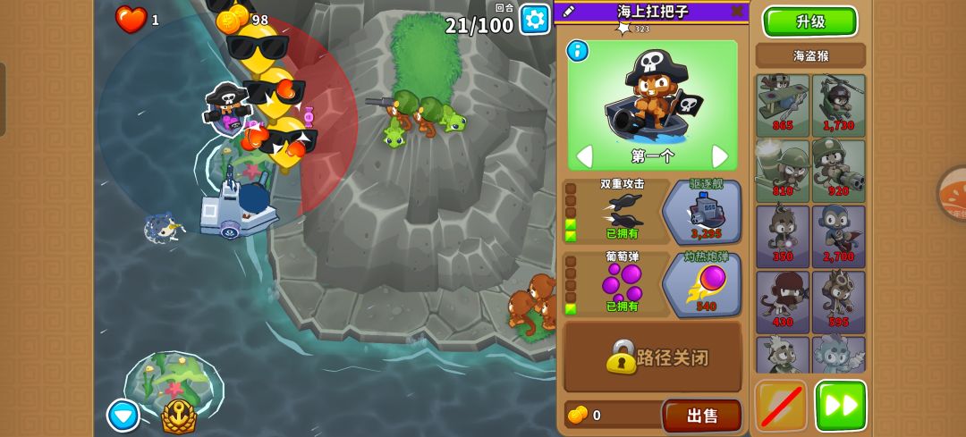 2,陆陆续续出五个海盗猴,最好全都围着猴村出,全升到320,然后选一个居中的升到520