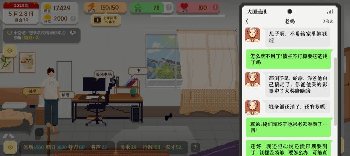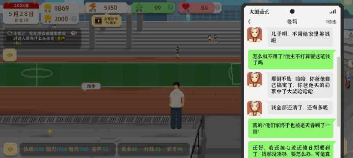 我是限时相亲那个完不成,开始 我觉得筹钱任务也不可能完成,但就在刚刚,我本来想着玩玩行政,后来我发现网吧可以赚钱,于是我就重开了两次,第一次我没有规划好所以就没完成差了四万左右,第二次我规划了一下,但是还没成功,但我发现可以去学校小卖部买零食吃,之后还可以点两次外卖,就是点完吃的还可以点喝的,我想我没有成功是因为我有几次都没有打游戏,后期也没有买药,而是健康不够就去操场锻炼,也没有看广告。现在分享一下我的第二把,首先就是每天打游戏加脑力,第一天直接去网吧上个网,然后兼职陪玩在点吃的跟喝的,饭点最贵的那个,之后在去体育场摸小猫,在去集市看看有没有垃圾,然后如果有4块的垃圾就直接卖。之后就是每天打游戏,看见垃圾就捡,去体育场跑3000米,如果学校开启了的话,在去学校坐双杠和椅子在买个小零食吃,之后去网吧上网点外卖做陪玩,(不推荐跟游戏大佬和三好学生练,三好学生输了给他50,游戏大佬输了给他10块,我就赢了一次游戏大佬,他给了我50。)如果还有体力就去集市,没有的话也没事攒着就行。以上事情做完如果还有8点体力的话看书加点脑力。还有就是前期健康少的话一定不要吃药,前期去体育场跑3000米加健康和体力上限,体力上限最高一共是150,后期的话买药,不行的话在去体育场,点外卖时候注意看,健康餐什么的都是常驻的,只有豪华餐(就是那个有一大堆加成的)是有时候有,有时候没有的,如果有那个豪华餐的话直接点,那个钱你陪玩是可以赚回来的,所以不要怕不行。最后就是每天睡觉一定要选择晚点睡,一定要库库玩手机加脑力。