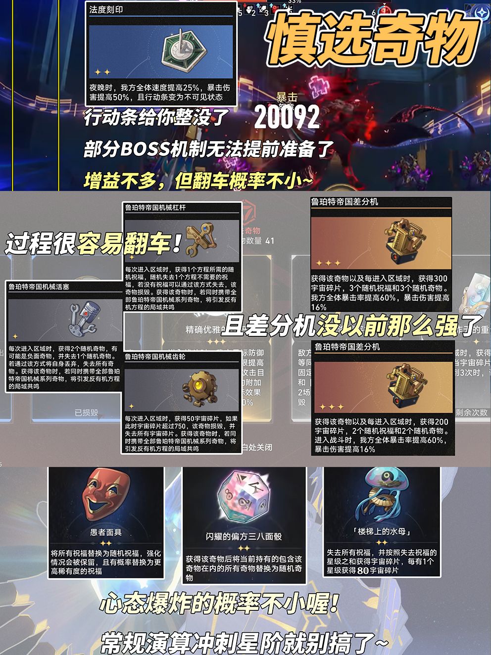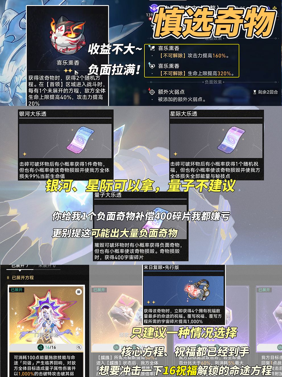 【大乐透系列】一定要看清楚是哪个!如果是‘量子’,给你随机负面奇物或400碎片,不划算。 【法度刻印】我的评价是,打得过不差这点增幅,打不过或勉勉强强的隐藏行动条直接致命。 【末日复眼•先行版】除非你关键方程、祝福都已经到手,想去搏一搏16个同命途祝福解锁‘临界方程’。