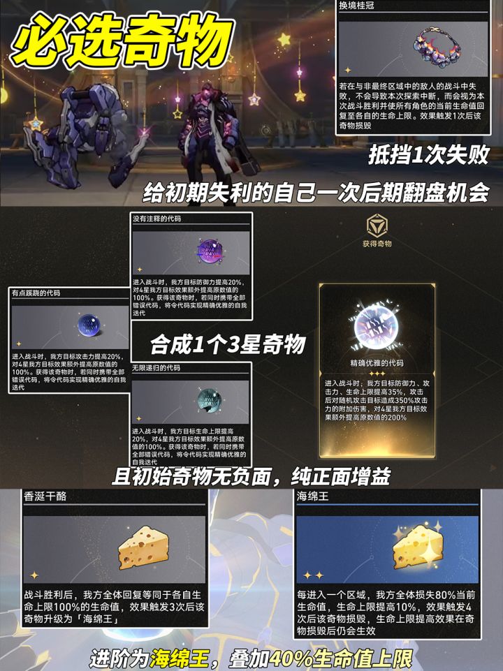 【没有注释的代码、有点蹊跷的代码、无限递归的代码】这三项都是1星奇物,遇到概率极大,且本身无任何负面效果。同时集齐三项,将直接合成为3星奇物‘精确优雅的代码’!