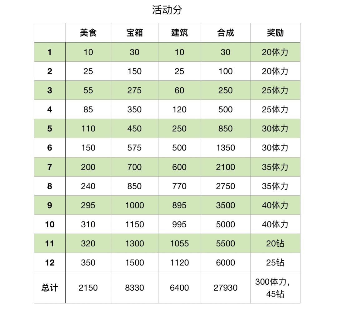 📌奖励为宝箱活动的奖励。美食、建筑、合成活动的11级奖励为40体力。