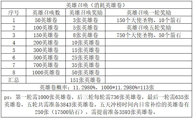 ps:第一轮需1000张英雄卷,后三轮每轮需736张英雄卷,最后一轮需635张英雄卷,五轮共需准备3843张英雄卷。五天冲榜时间内日常补给的英雄卷有250张(17500钻石),需提前准备3593张英雄卷。
