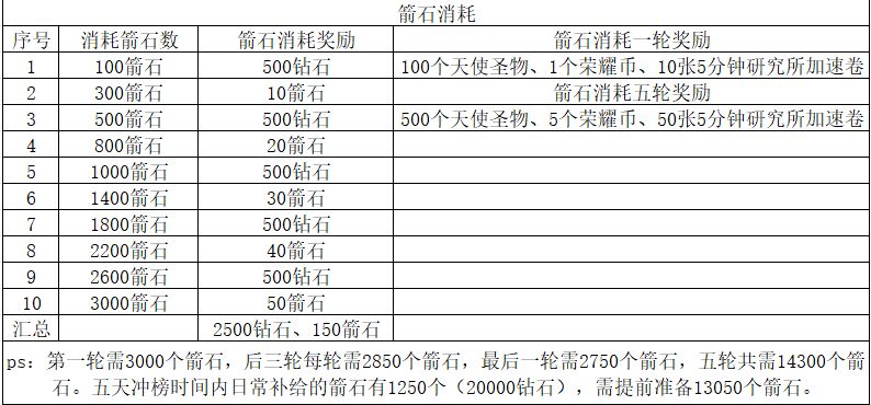 ps:第一轮需3000个箭石,后三轮每轮需2850个箭石,最后一轮需2750个箭石,五轮共需14300个箭石。五天冲榜时间内日常补给的箭石有1250个(20000钻石),需提前准备13050个箭石。
