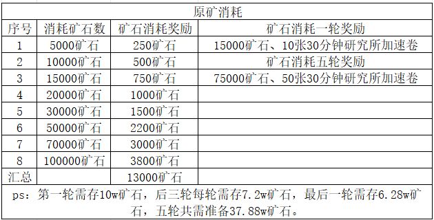 矿石消耗五轮奖励(75000矿石、50张30分钟研究所加速卷)