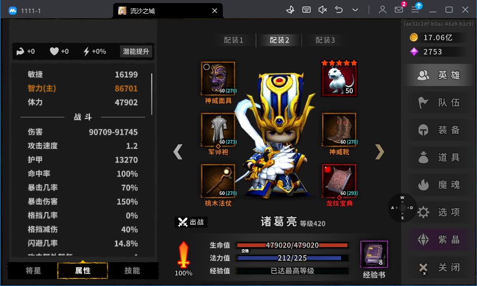 装备选择:防具军师三件套,主手副手选智力+智力百分比的
