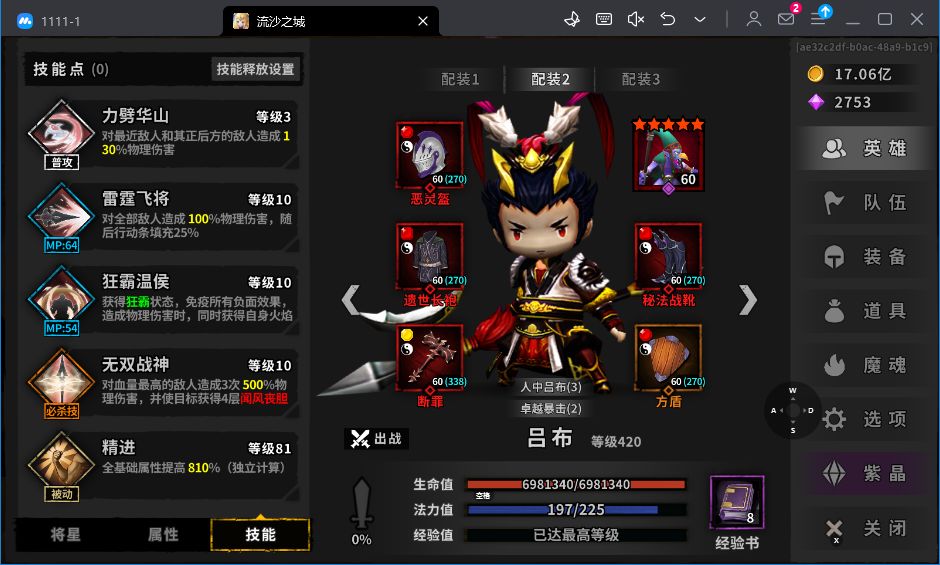 技能设置:2222 , 单怪技能4(有些同学可能会漏个怪导致吕布把蓝打空,这里设置单怪4,唯一的翻车点就是4技能打鲜血蜥蜴被反弹死,但只要可以跟蜥蜴同归就没问题)