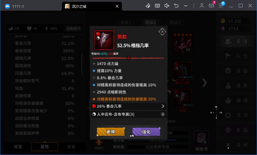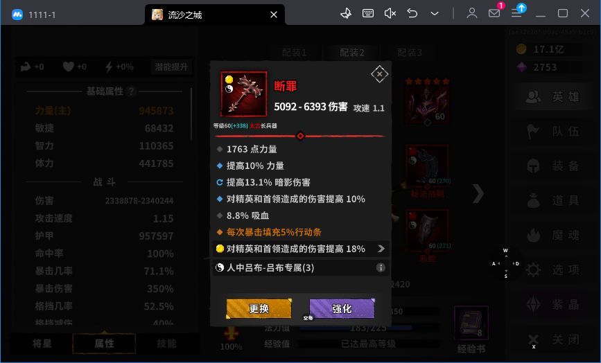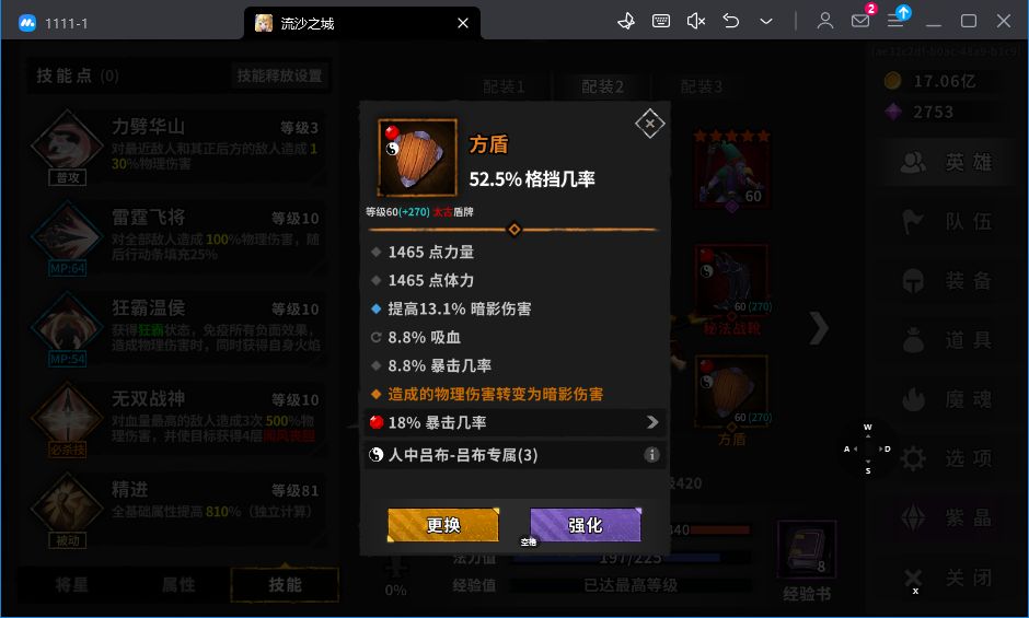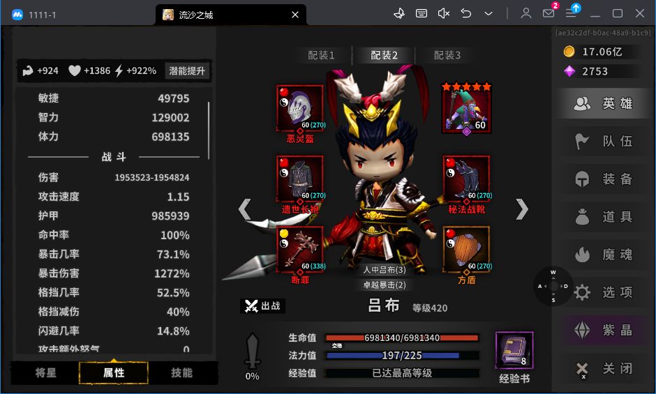 套装选择:吕布专属三件套,强健体格2件套(也可以用卓越暴击2件套,减轻前期暴击压力)