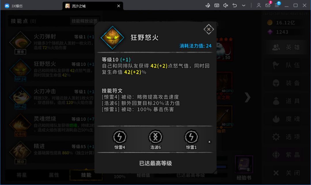 技能34点满即可,3技能+怒气被动点满
