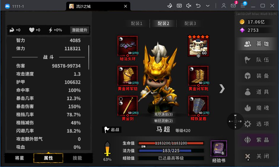 装备选择:黄金将军(+地图攻击即可)