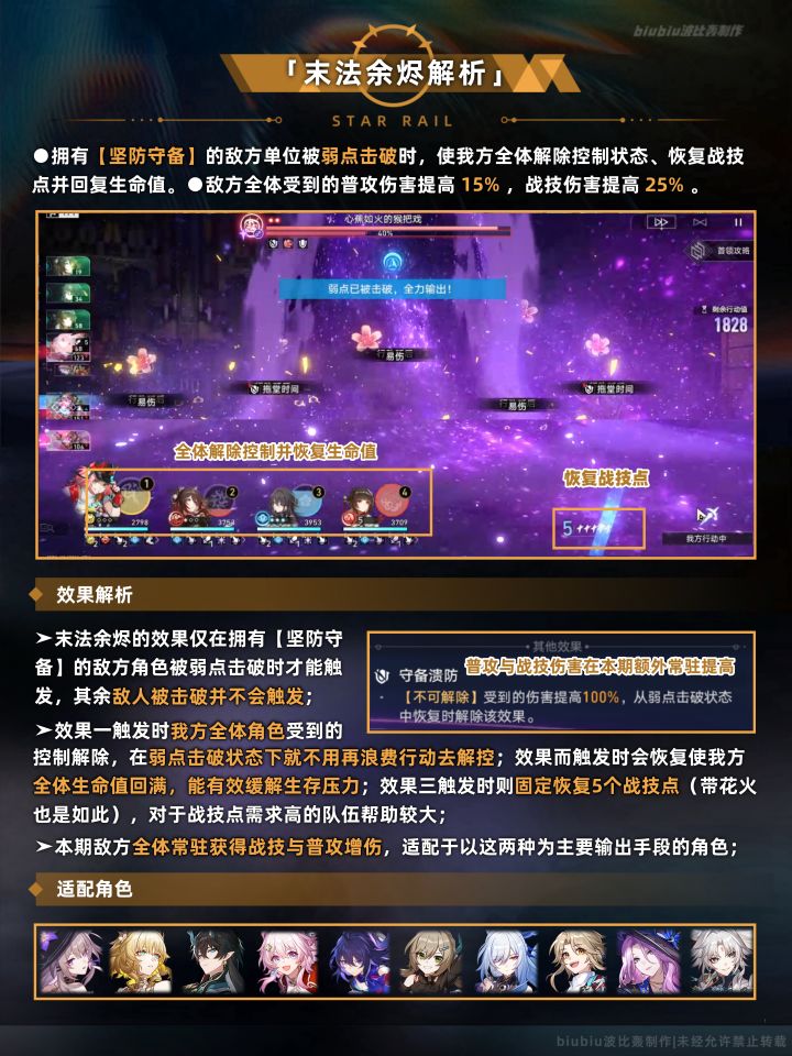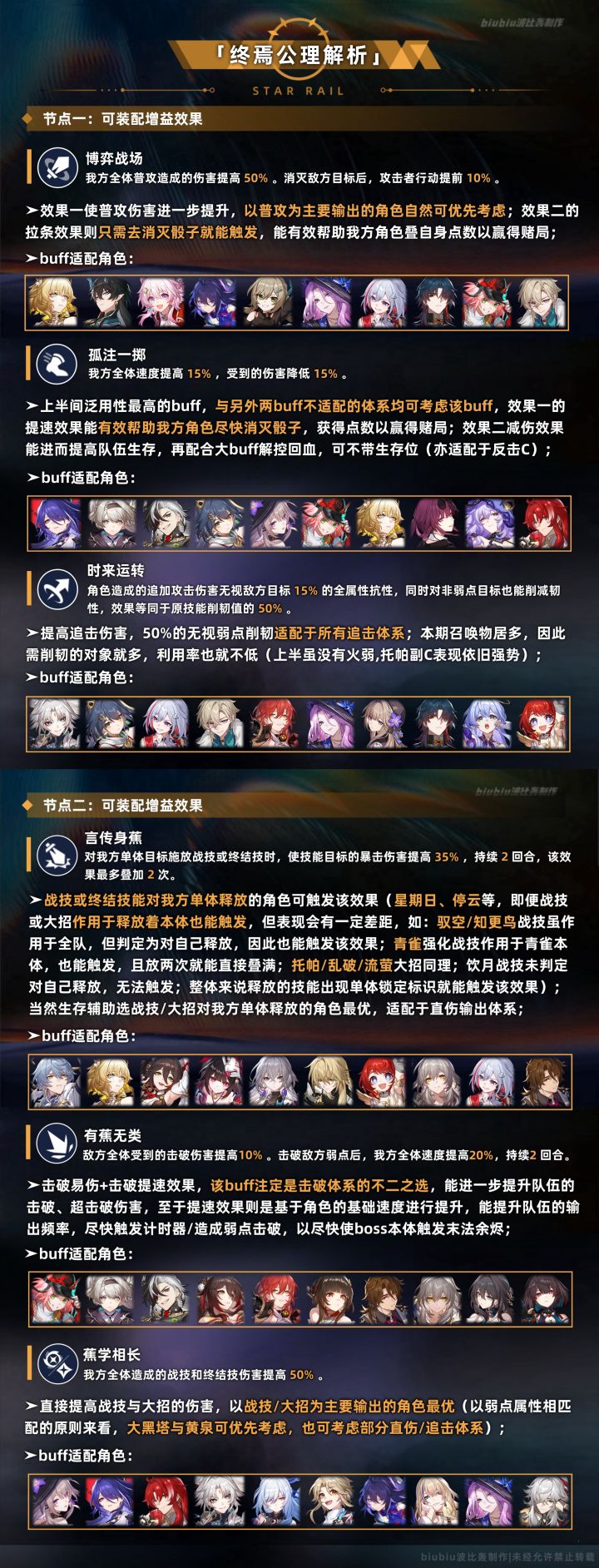 本期buff环境依旧利好击破体系,大buff触发时会造成解控、恢复生命、会战技点三种效果,拿来应对上半诡弈砂金的控制效果与高伤害技能还是不错的;常驻buff则是战技与普攻增伤,自然适配于以这两种为主要输出手段的角色;