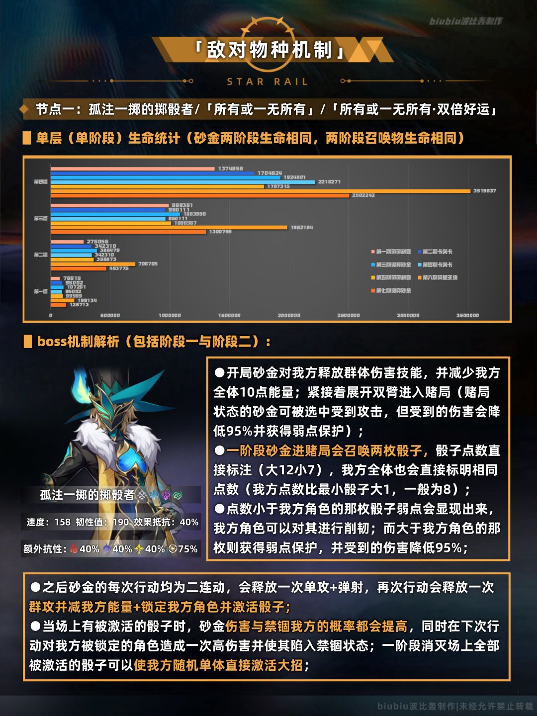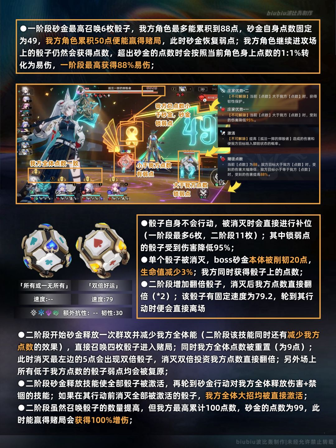 本期上下半两只boss均在往期遇到过;两只boss机制性都比较强,实战时需要了解其机制才能取得不错的分数;上半间的诡弈砂金与混沌中的不一样,这里的骰子是有生命值的,消灭骰子才能获得点数,并且场上会有锁弱点减伤的骰子,需要我们手动去消灭那些未锁弱点的骰子才能尽快赢得赌局;开自动可能会去瞄准那些锁弱点的,这样会消耗大量行动值,最终分数就会大打折扣,因此对自动挡并不是那么友好;
