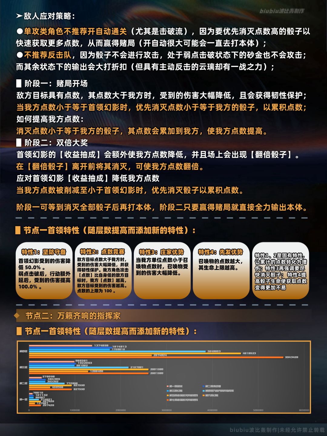 上半间总体来说偏向于对单环境,因为在常规状态下诡弈砂金的骰子并非均容易被消灭掉,只有那些暴漏弱点的骰子才容易被消灭,至于诡弈砂金被击破后则只需要全力对抗本体即可,对单高伤害的角色自然会更有优势;下半则由于共享血条机制存在,因此是纯粹对群环境,但非群攻体系则仍然建议手动,非击破体系要去命中那些计数器未被打满的单位攻击,打满计数器以尽快击破boss;