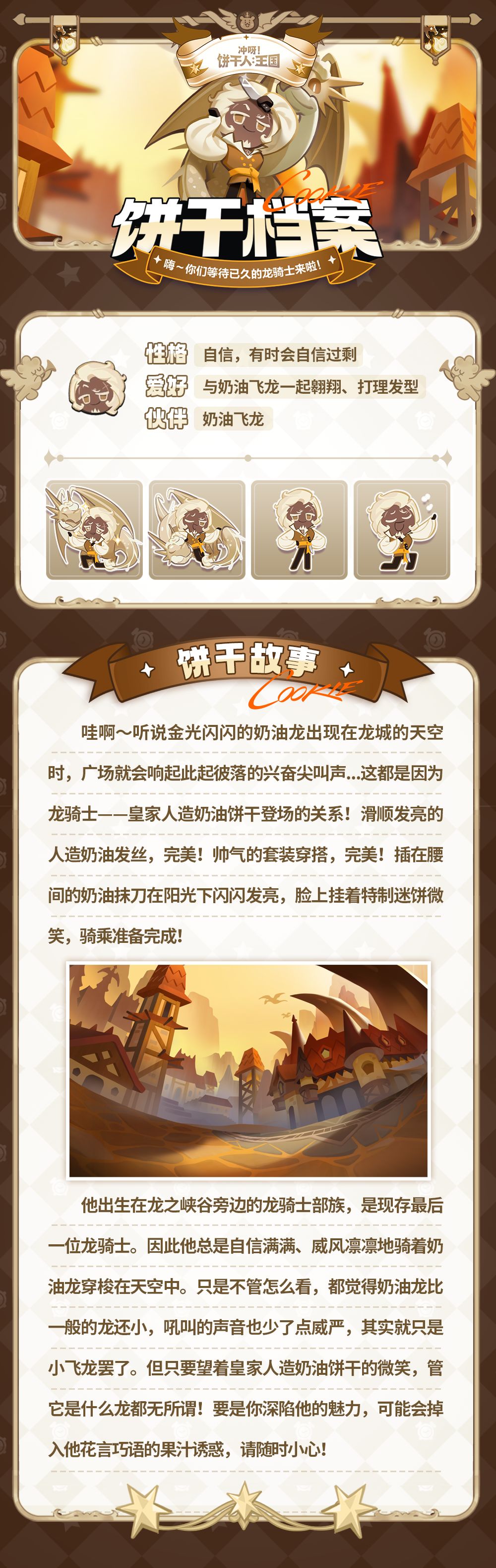 他出生在龙之峡谷旁边的龙骑士部族,是现存最后一位龙骑士。因此他总是自信满满、威风凛凛地骑着奶油龙穿梭在天空中。只是不管怎么看,都觉得奶油龙比一般的龙还小,吼叫的声音也少了点威严,其实就只是小飞龙罢了。但只要望着皇家人造奶油饼干的微笑,管它是什么龙都无所谓!要是你深陷他的魅力,可能会掉入他花言巧语的果汁诱惑,请随时小心!