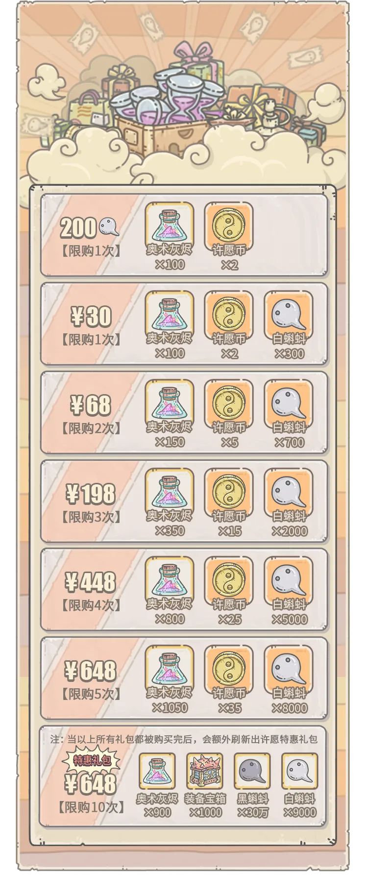 活动期间,贩售机将出现福利礼包,每天5点刷新,售价1白蝌蚪。