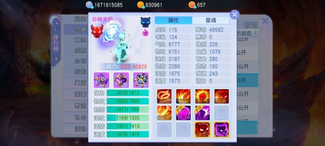 属性不理想的原因出现在了星魂的上面!物攻和速度是绝对没有问题的,但是物防对于这只宠物来说是等于没有的!把它洗成速度就更加完美了!