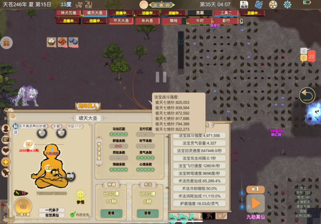 一切准备就绪,修炼到在世真仙开始攒分神,前面阶段只需要攒20条分神就够了,因为两仪是双倍分神还是比较容易做到,吃一个猫妖之珀,三个法宝丹,三个分神技能,再渡三次天劫就凑齐了。注意不要用分神之术拿分神