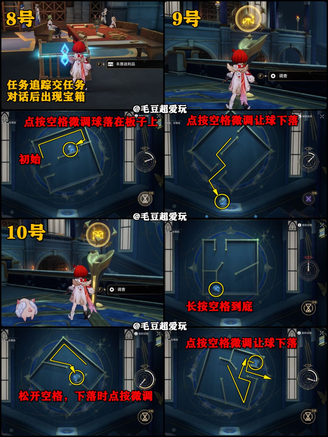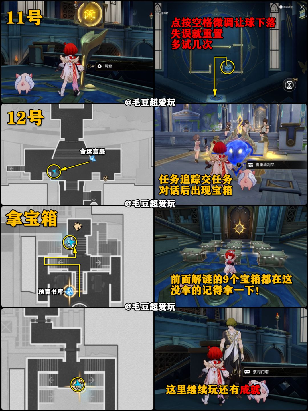 每次解谜后都需要与“祭司门塔”对话,每完成3次解谜后跟随任务指引与其他NPC交互,解谜包含9个宝箱,对话奖励包含3个宝箱,完成所有谜题后可继续与“祭司门塔”对话,后续奖励为成就。