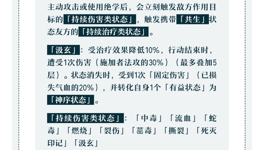 天赋可以引爆持续伤害状态,不过这些持续伤害状态有几乎全都是固伤,所以PVP不算很实用,不是固伤的持续伤害状态只有撕裂(春兰的)和树皮老登自己的汲玄,神序状态给到的冰霜煞火惊霆也全都是固伤。