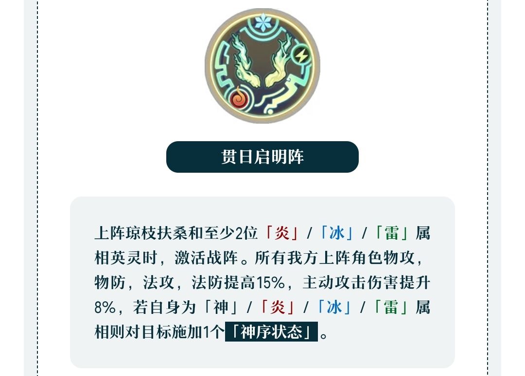 阵也是在为神序状态服务,如果队伍里其他的输出位都是火冰雷属性的话,叠加神序状态的效率会非常高,可以称为dot队伍了。