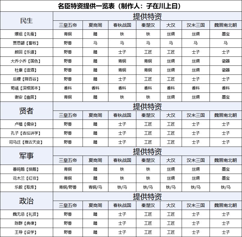 同时为了方便王上们获取特资(当然,这边贸易是最简单的方法,不过也有部分名臣的政策能够提供特资),所以也给出名臣特资提供一览表以供参考。