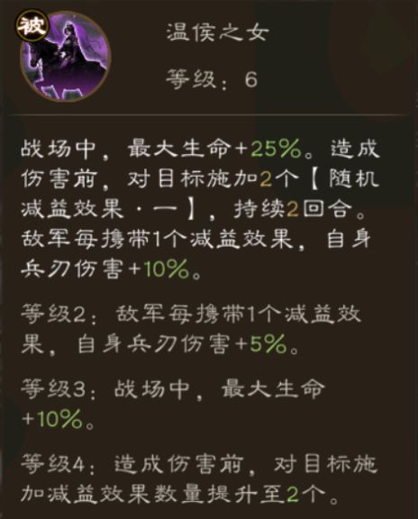 ▶ 天赋描述:战场中,最大生命+25%。造成伤害前,对目标施加2个【随机减益效果·一】,持续2回合。敌军每携带1个减益效果,自身兵刃伤害+10%。