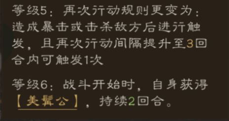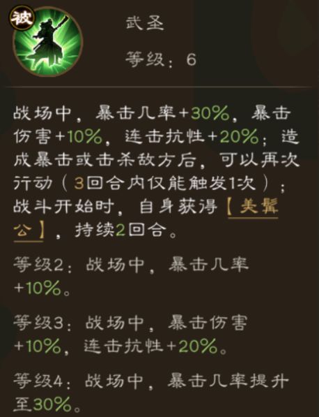 ▶ 天赋描述:战场中,暴击几率+30%,暴击伤害+10%,连击抗性+20%;造成暴击或击杀敌方后,可以再次行动(3回合内仅能触发1次);战斗开始时,自身获得【美髯公】,持续2回合。