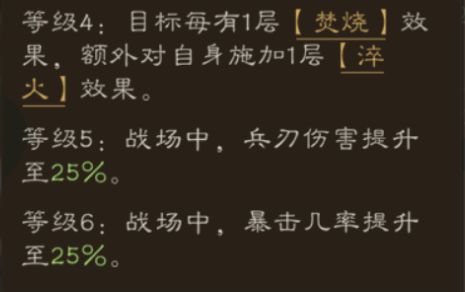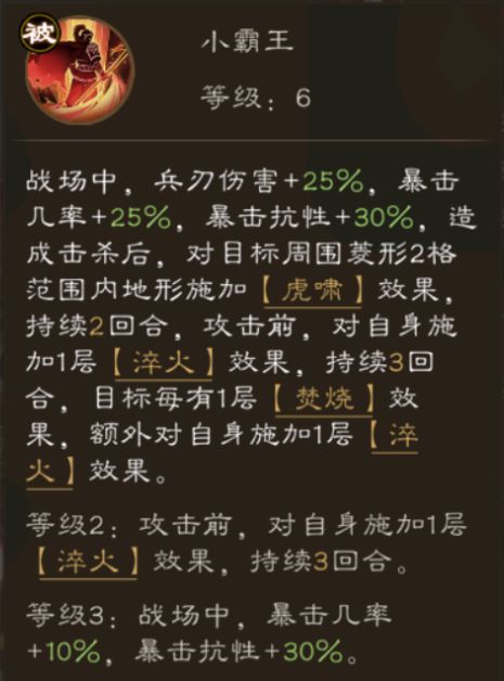 ▶ 天赋描述:战场中,兵刃伤害+25%,暴击几率+25%,暴击抗性+30%,造成击杀后,对目标周围菱形2格范围内地形施加【虎啸】效果,持续2回合,攻击前,对自身施加1层【淬火】效果,持续3回合,目标每有1层【焚烧】效果,额外对自身施加1层【淬火】。