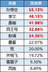 【禁用率前五】孙悟空、李文、桑榆、西王母、敖璃