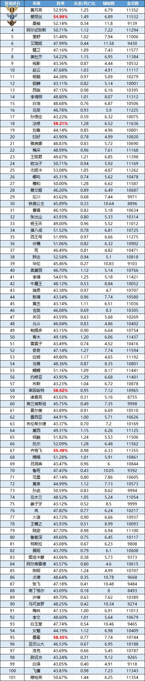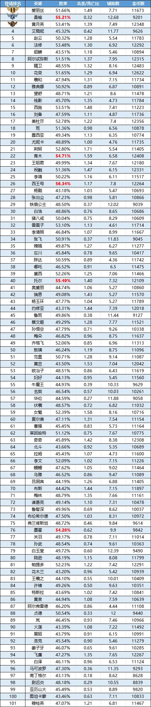 排序:按登场率高低排序,标红为胜率前5