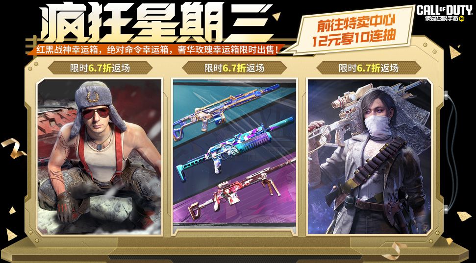 3月5日(本周三),疯狂星期三精彩不停!本周返场的幸运箱分别是:红黑战神幸运箱、绝对命令幸运箱和奢华玫瑰幸运箱。活动期间战士们将享受6.7折的超值福利优惠,快来看看吧~