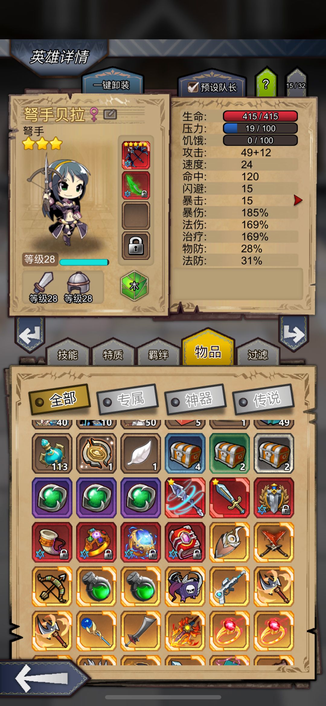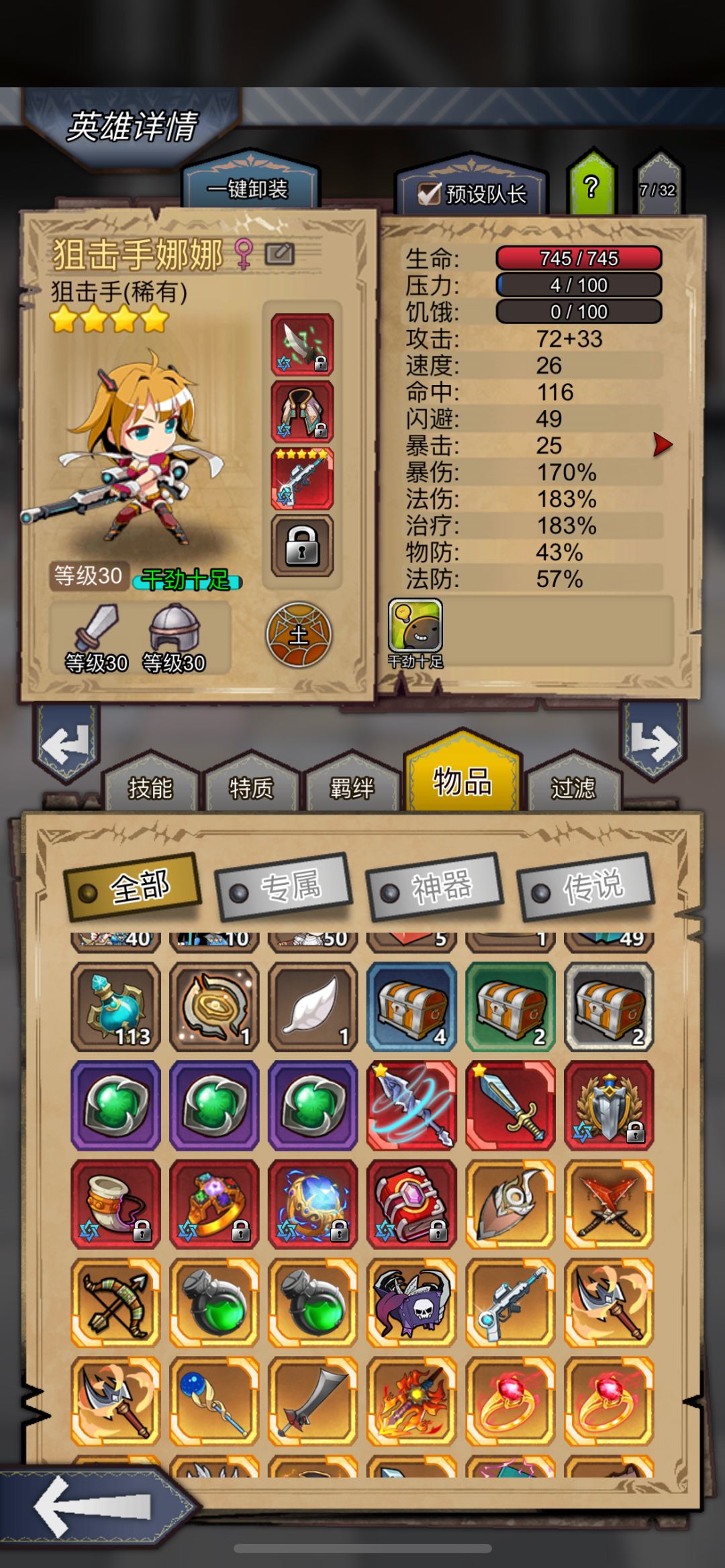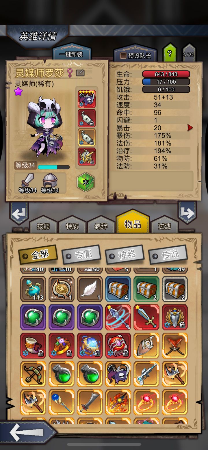 感谢独宠一女大佬指导,把 3 星弩手换成了 5 星圣骑,97 头和绿刀换给镇长,整个队伍刚猛了许多,目前爬到 250 层,现阶段伤害不够,毒叠不动