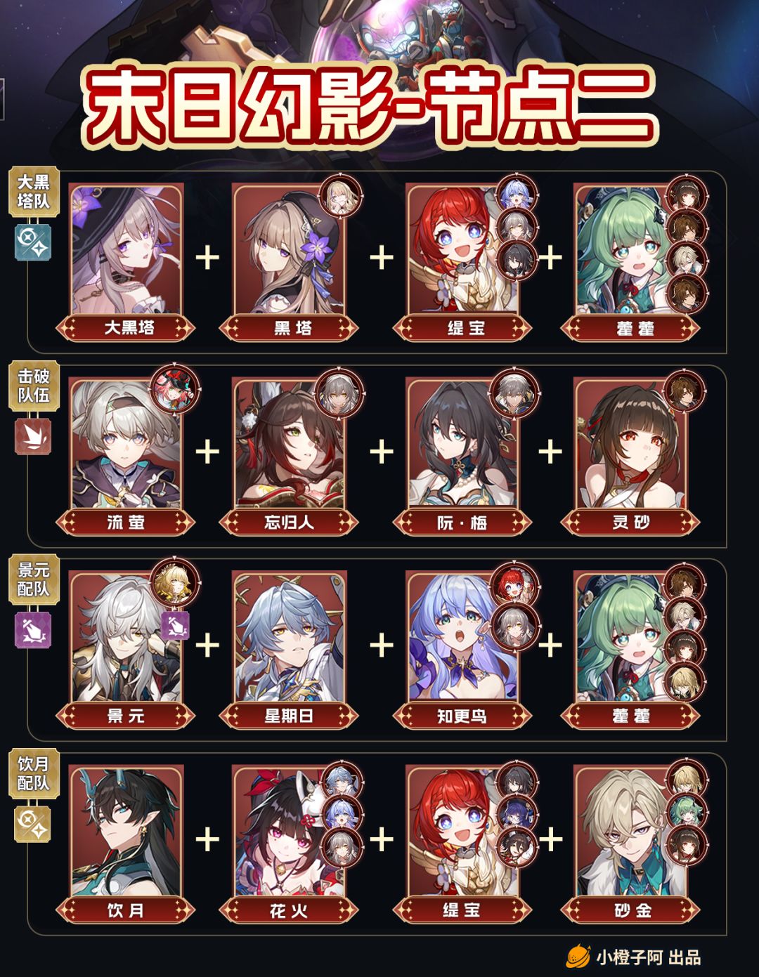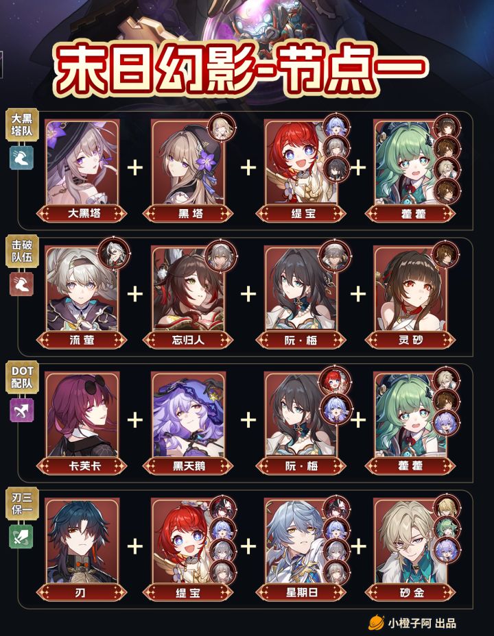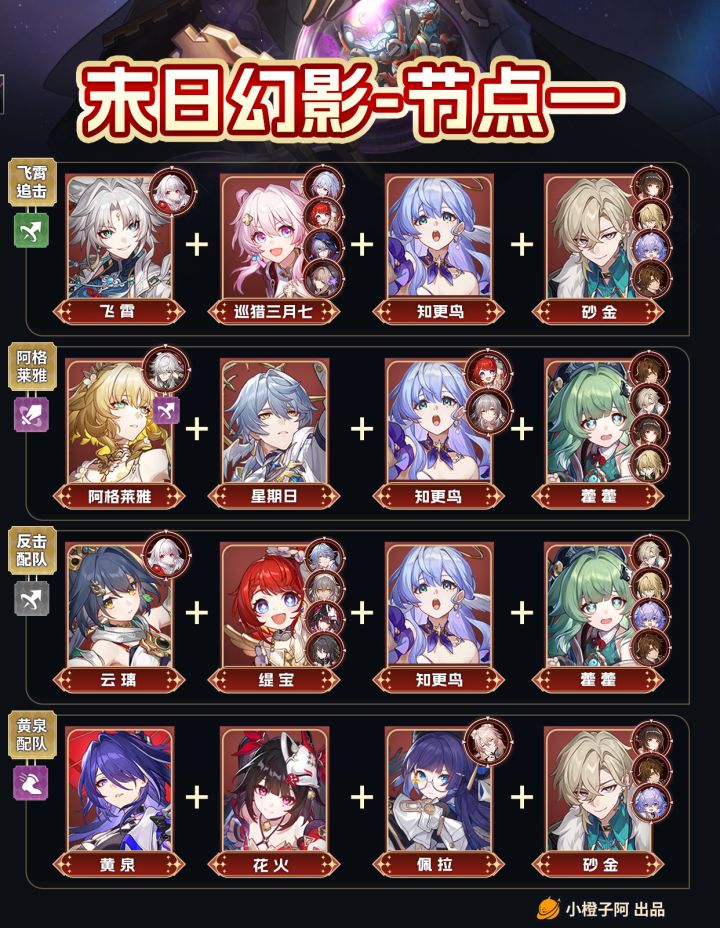 大家好哇,这里是小橙子阿。 这一期橙子带来了新末日幻影的配队推荐,这一期节点一是【孤注一掷的掷骰者】,推荐了6种配队,节点二是【心蕉如火的猴把戏】,由于弱点机制等原因只推荐了3种配队。