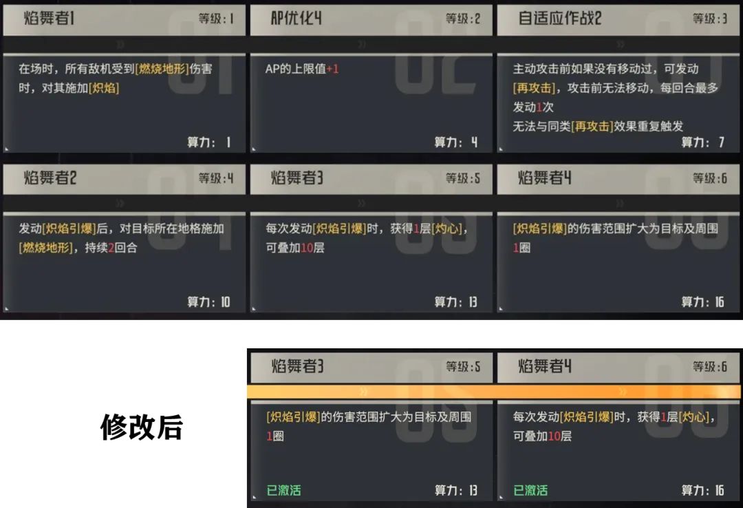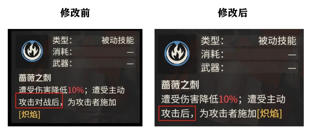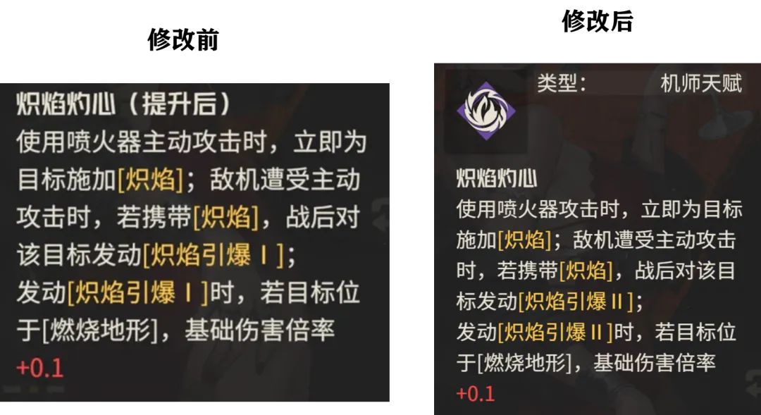 那么首先第一个修改点是针对阿黛勒天赋的修改,具体就是把“使用喷火器主动攻击时”改为了“使用喷火器攻击时”,这个去掉主动二字的意义大家也都看得懂,反正就是小幅的提升了阿黛勒施加“炽焰”状态的频率。