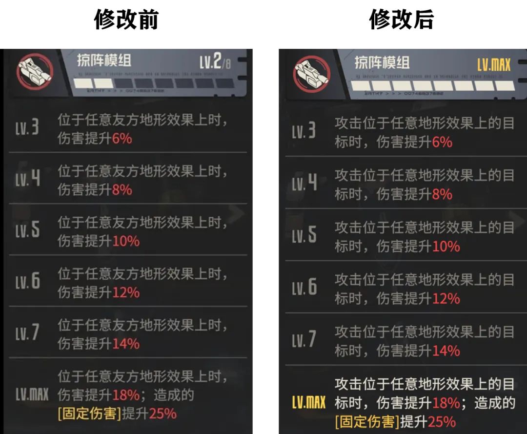 然后是对于阿黛勒专属机兵影舞者的次级模组调整,把原本的“友方地形”给调整为了任意地形效果,算是小幅度提升了影舞者这个机兵的竞争力。而以上4个调整就是今天更新后官方对于阿黛勒的小幅度增强了,此外官方在修复了部分bug后,例如阿黛勒打泰坦类占4个敌人可以触发多次固伤的现象......这次也给一并修复掉了,目前测试服中占据4格的敌人,也和占据1格的敌人一样只能触发单部位的1次固伤了,这.......