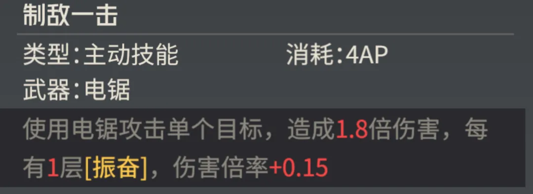 第五个技能【制敌一击】则又是一个单体输出技能,4AP换1.8倍的伤害看起来还行,此外还可以根据怀亚特“振奋”的层核素来提升伤害倍率,最高可以提升0.75倍伤害,相当于这个技能的伤害上限就是4AP换2.55倍伤害,这个倍率看起来就有点可观了对吧。