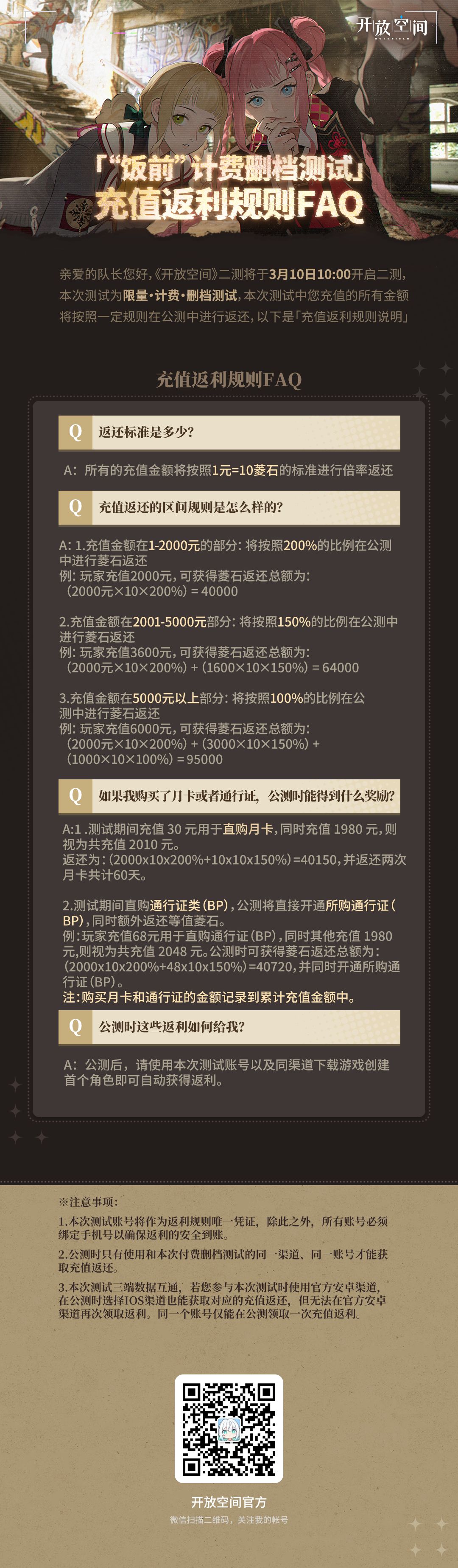 亲爱的队长您好,《开放空间》二测将于3月10日10:00 开启二测,本次测试为限量|计费|删档测试,本次测试中您充值的所有金额将在公测中进行返还,我们为您准备了「充值返利规则说明」,队长可循着这份指引领取对应的福利回馈~、