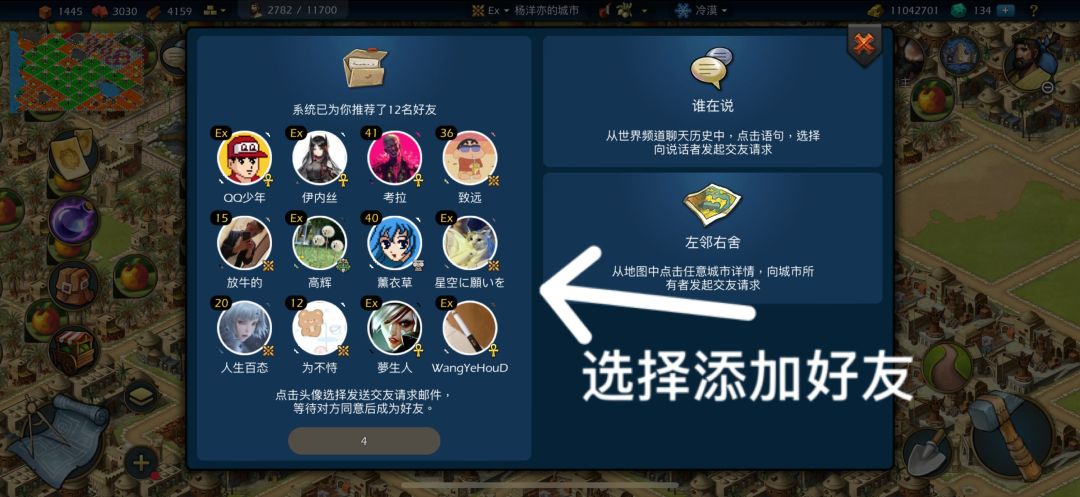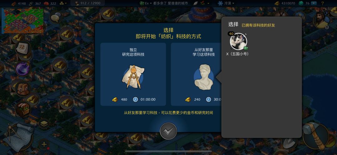4.好友添加成功过后,我们的科技所需要花费的金币和时间自然减半啦,当然咯别人如果学习你的科技所花的金币,会为你提供部分金币收哦!!还有别人拜访你的城市也会有10金币收益。在上面教过的好友界面会告诉你谁来拜访且会提供你的好友的进度,和提供拜访和好友学习你科技上供的金币哦,可要抓紧啦!