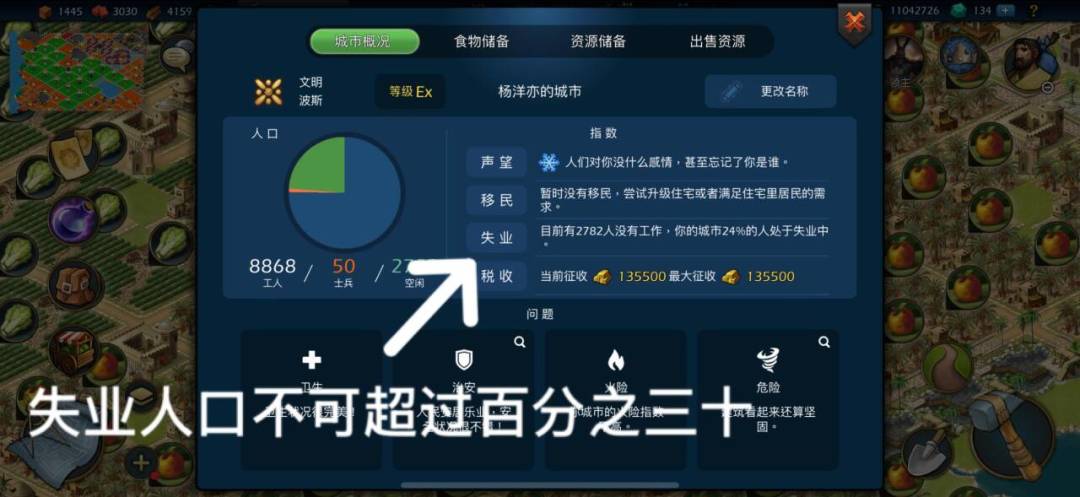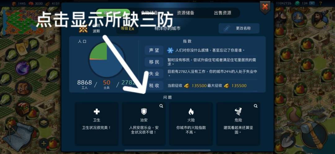 1. 点开主页面左下角人口即城市概况,点击下面四个问题,如果是三防没做好,会自动跳转去缺乏三防的地方,相应的箭头会对准建筑,再修建建筑所相应的三防就可以了,如果四防都没问题的情况下,请查看是否有废墟未清理,也影响刁民态度。