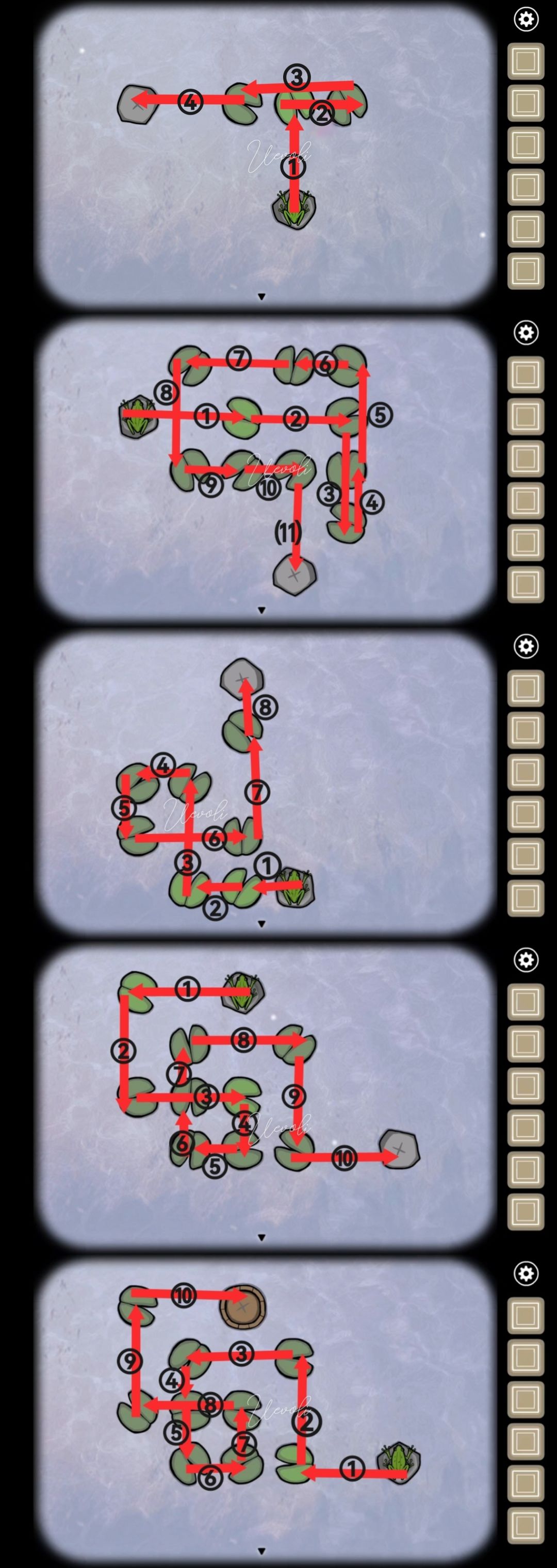 Logic|要求只走横竖方向且最多跨两格,将所有荷叶都走过,并最终落脚石头上,共5小关