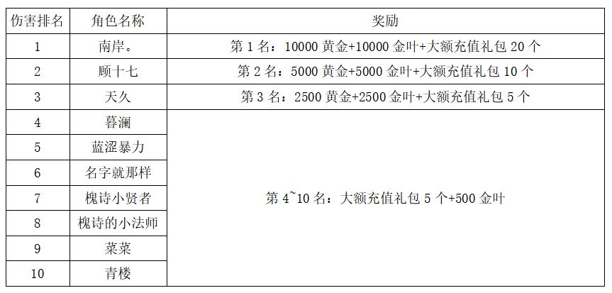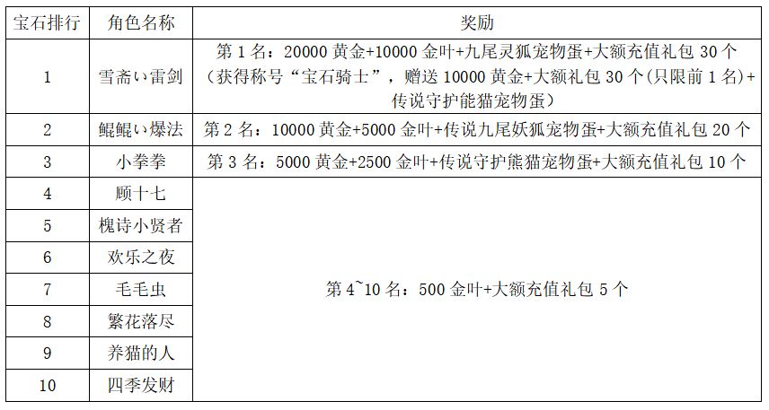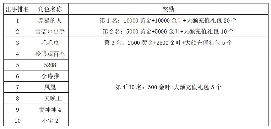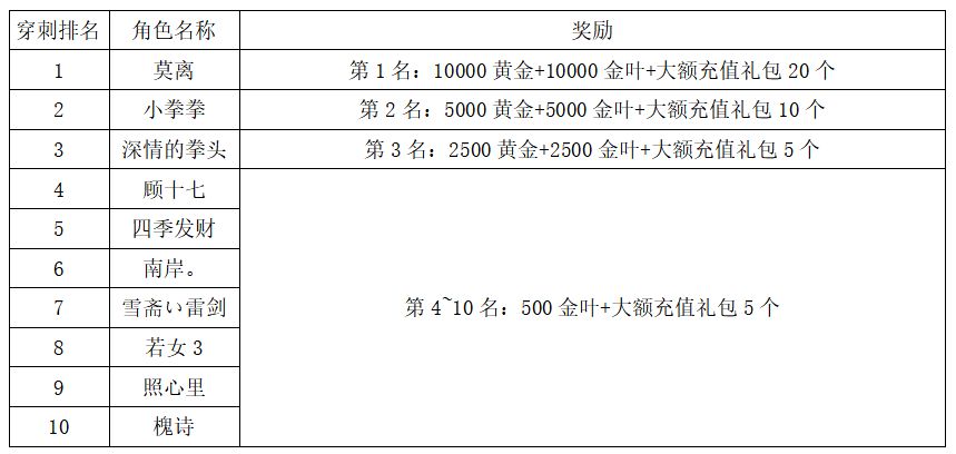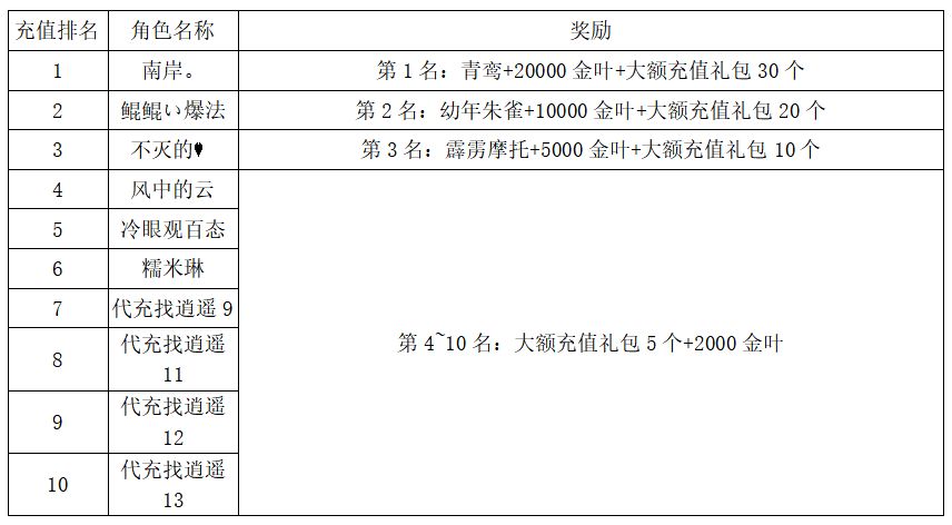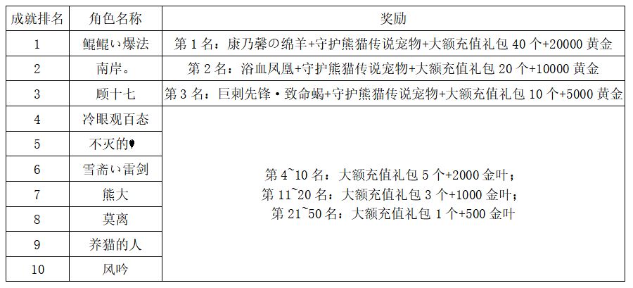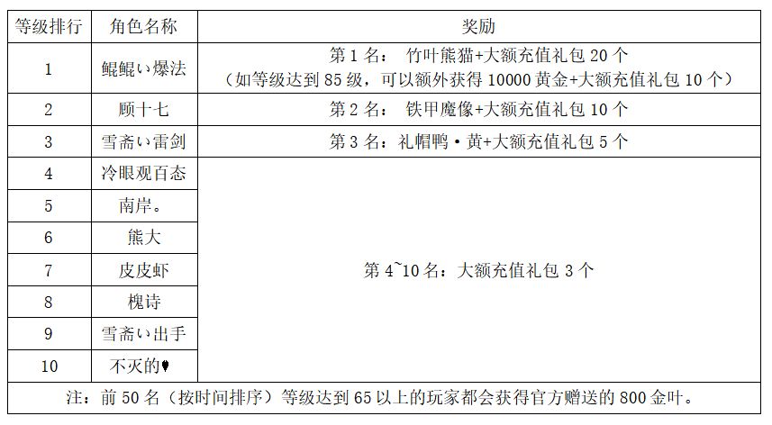 注:以上活动排名均以服务器时间为准。新区排行榜活动如发现存在违反游戏相关规定使用游戏外的辅助工具进行作弊将取消获奖资格。