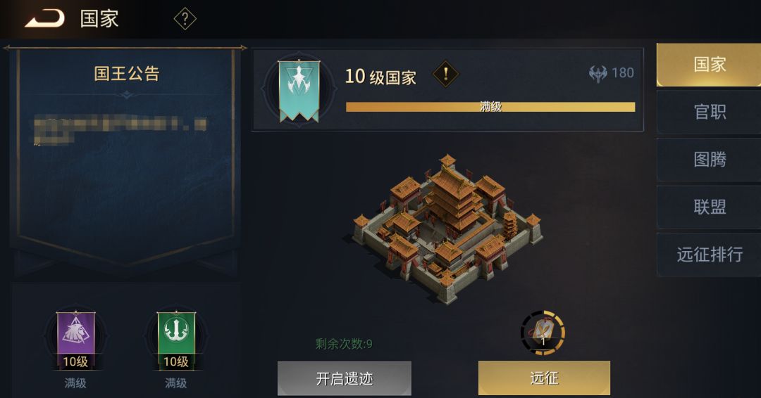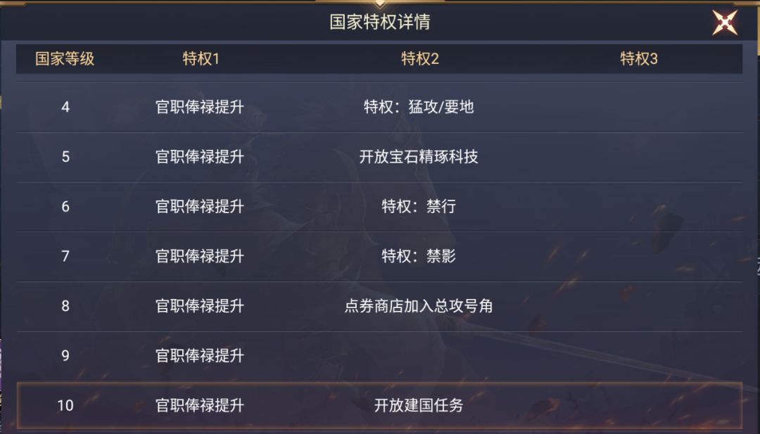 2、国家等级共分为10个等级,每次等级提高玩家获得的官职俸禄就会提升,国家到达3级后解锁远征功能,4级开启特权:猛攻/要地,5级开放宝石精琢科技,6级开启特权:禁行,7级开启特权:禁影,8级在点券商店内加入总攻号角,10级开放建国任务!