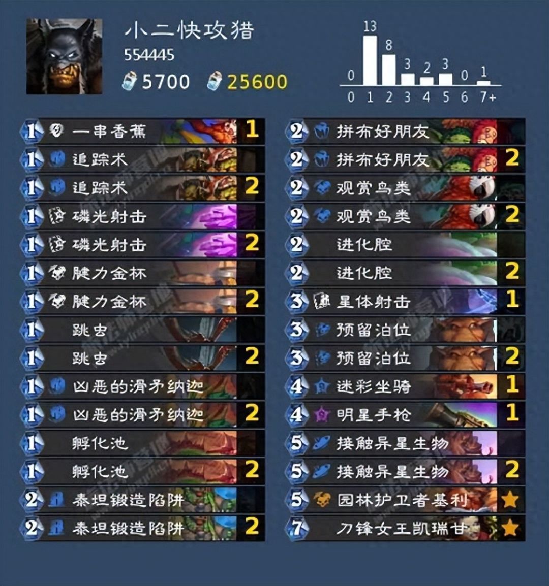 综合点评:这套快攻猎节奏非常快,面对中慢速的德鲁伊、战士和术士都有着不小的优势,平均对局时间也是最短的,面对不墨迹的对手,我们基本在八分钟以内就能结束战斗,很适合钻石五-传说分段这个阶段使用,适合讲求追求高效上分的小伙伴。这里带众多一费卡的目的就是为了极限前期节奏,但是还是存在发牌员恶意针对的可能。对局最不想看到的就是园林护卫者基利,起手换牌牌最不想看到的就是他,五费高消耗,会影响预留泊位和腱力金杯的buff效果。