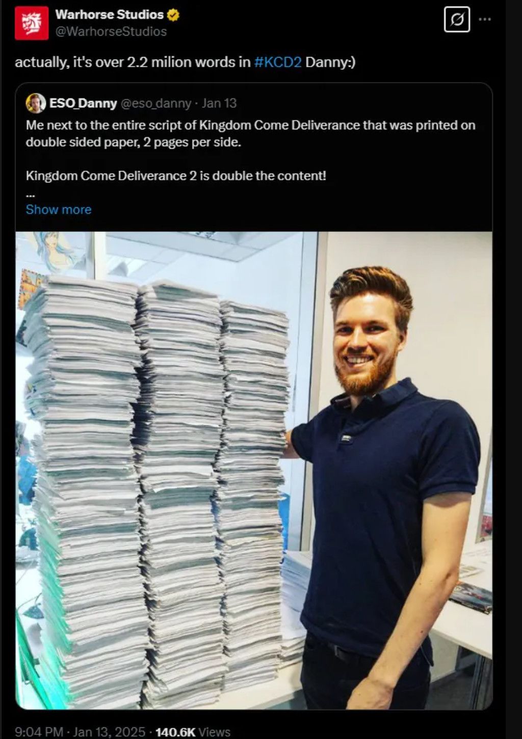 他说:“6-7年……写作从来不会结束,总是不断有新的用法涌出,新的事情可以做”,难怪《天国:拯救2》有这么多事情要做。对比而言,只有《博德之门3》的剧本接近200万字。