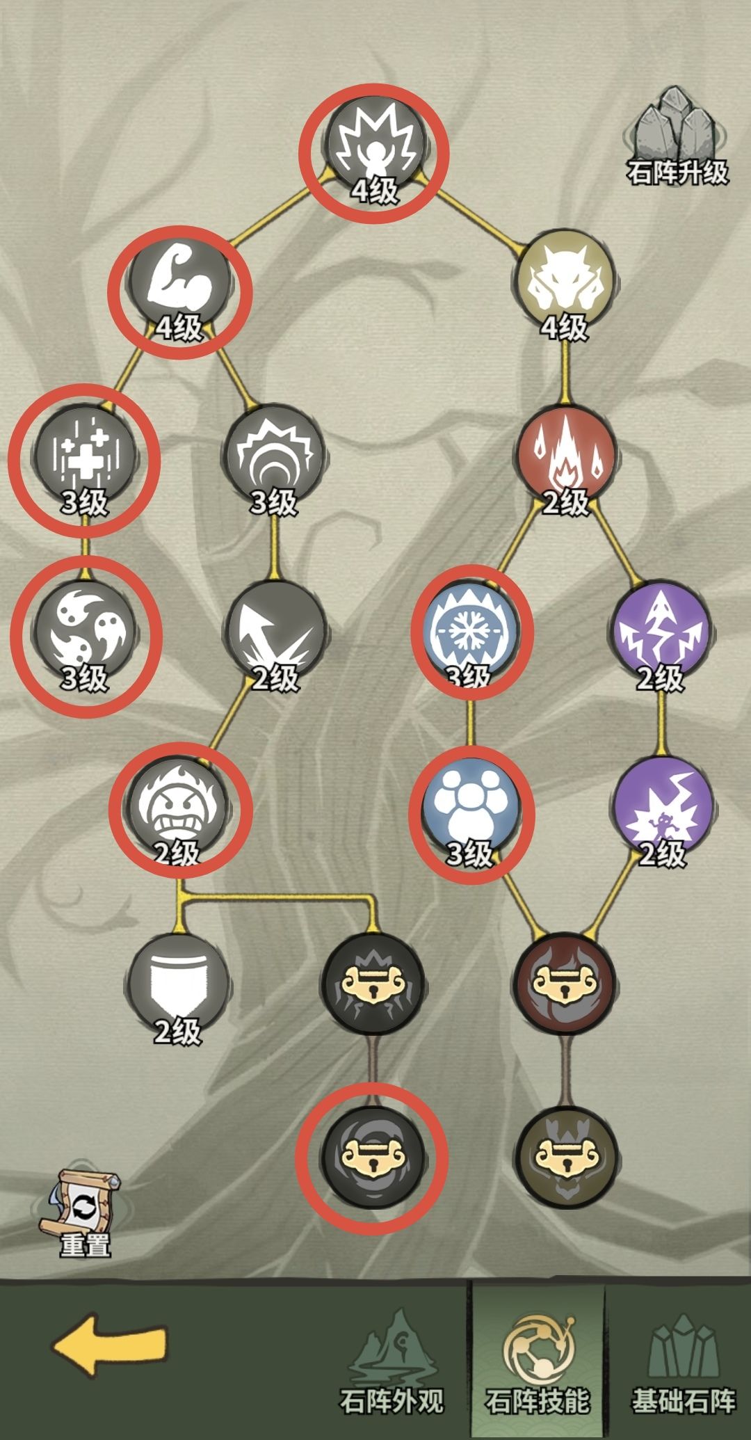 图内我圈起来的技能是相对比较重要的,那些伤害型的技能和赌概率的技能个人觉得不太靠谱,不过补天石够的情况下倒是可以去升一升。