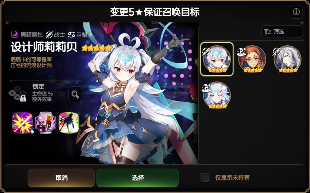 5星月光角色:「设计师莉莉贝」「白银刀刃的雅拉敏塔」「史瑞杰思」「雪国的苏莉塔妮亚」四选一